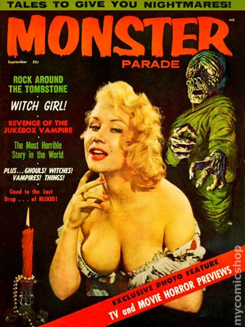Monster Parade was the first monster mag after Famous Monsters of Filmland, and featured horror fiction as well as features on horror movies. Horror fiction, monster movies on TV and in the cinema, and 1950s culture. Rock Around the Tombstone; I'll Love You to Death; Horror Show; Feeding Time at the Zoo; Revenge of the Jukebox Vampire; Witch Girl; Most Horrible Story in the World; Feed Me, Mr. Wodgett; Movie-TV Monster Previews: Fiend Without a Face; Monsters in Your Living Room; The Haunted Strangler; Come Into My Parlor; You'll Die Laughing. 8 1/2-in. x 11-in., 64 pages, B&W. Cover price $0.35.