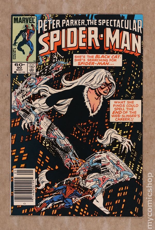 Tags: Chronological Appearances of Spider-Man's Black Costume (part 11 (2nd app. after Official Debut)), Marvel Legacy Numbering: Spectacular Spider-Man (part 90), Print Run Statistics, Secret Wars (1984) (part Aftermath 07), Black Cat, Spider-ManSpectacular Spider-Man (1976 1st Series) 90D VF+ 8.5