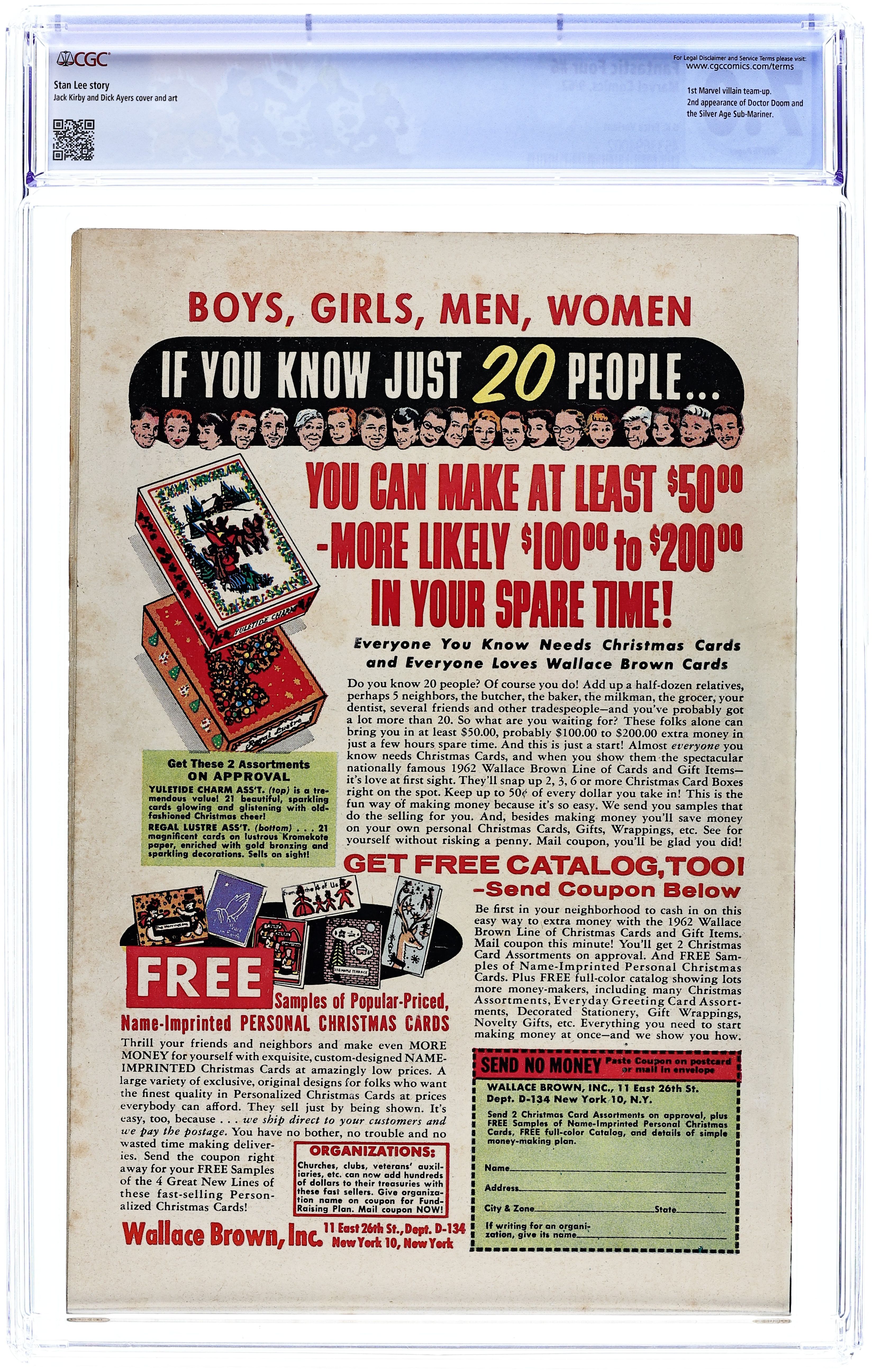 UK edition. Identical to US edition but has 9d cover price. Cover pencils by Jack Kirby, inks by Dick Ayers. Dr. Doom and the Sub-Mariner team up (first Marvel villian team-up and second Silver Age Sub-Mariner appearance) in "Captives of the Deadly Duo!" Part 1, script by Stan Lee, pencils by Jack Kirby, inks by Dick Ayers; Doctor Doom presents himself to Sub-Mariner and offers him an alliance against the Fantastic Four and all mankind. When Super-Menaces Unite Part 2; Dr. Doom gives a "Grabber" to Sub-Mariner and Human Torch discovers that Invisible Girl hides a photo of the Sub-Mariner in a book. Part 3 When Friends Fall Out!; The Sub-Mariner plants the "Grabber" in the Baxter Building and it is lifted into space by Doctor Doom. Part 4 Trapped!; The Baxter Building is set on a collision course with the Sun and the Sub-Mariner discovers that Doctor Doom has betrayed him. Part 5 The End... or the Beginning?; Doctor Doom is flung out into space and the Baxter Building is returned to its foundation. First mention of "unstable molecules." 36 pgs.