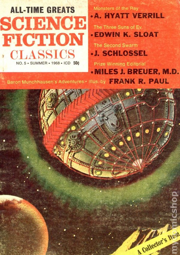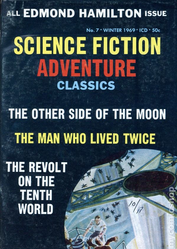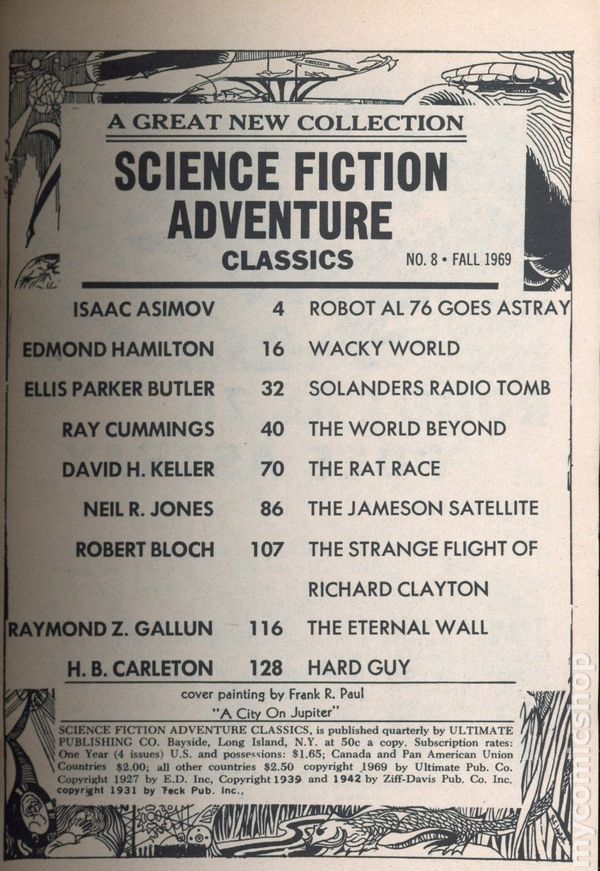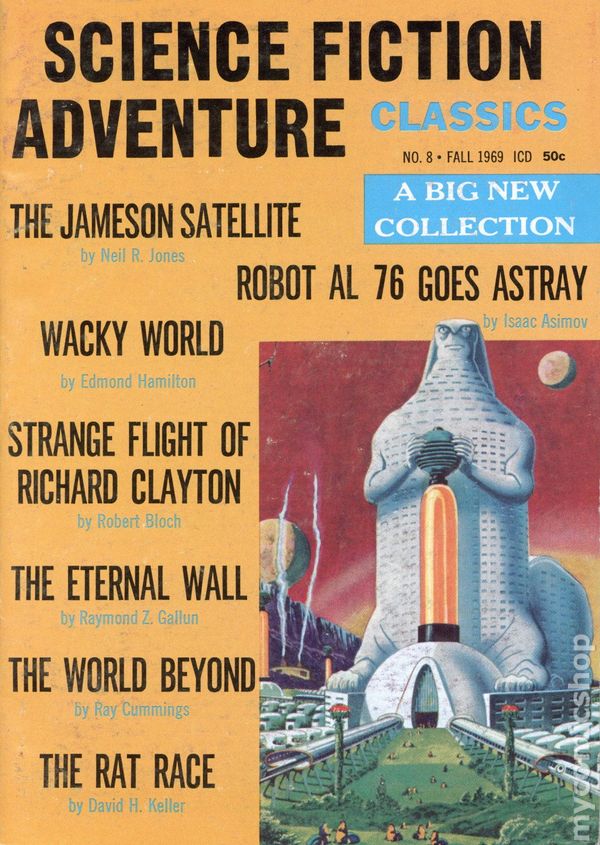 Fall 1969; whole number #8. Science fiction stories: "Robot Al 76 Goes Astray" by Isaac Asimov, "Wacky World" by Edmond Hamilton, "Solanders Radio Tomb" by Ellis Parker Butler, "The World Beyond" by Ray Cummings, "The Rat Race" by David H. Keller, "The Jameson Satellite" by Neil R. Jones, "The Strange Flight of Richard Clayton" by Robert Bloch, "The Eternal Wall" by Raymond Z. Gallun, and "Hard Guy" by H.B. Carlton. Illustration by Carmine Infantino. Cover by Frank R. Paul. 5.25-in. x 7.5-in.; black and white; 128 newsprint pages. Cover price $0.50.