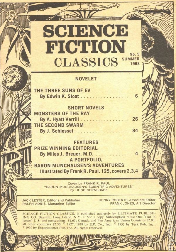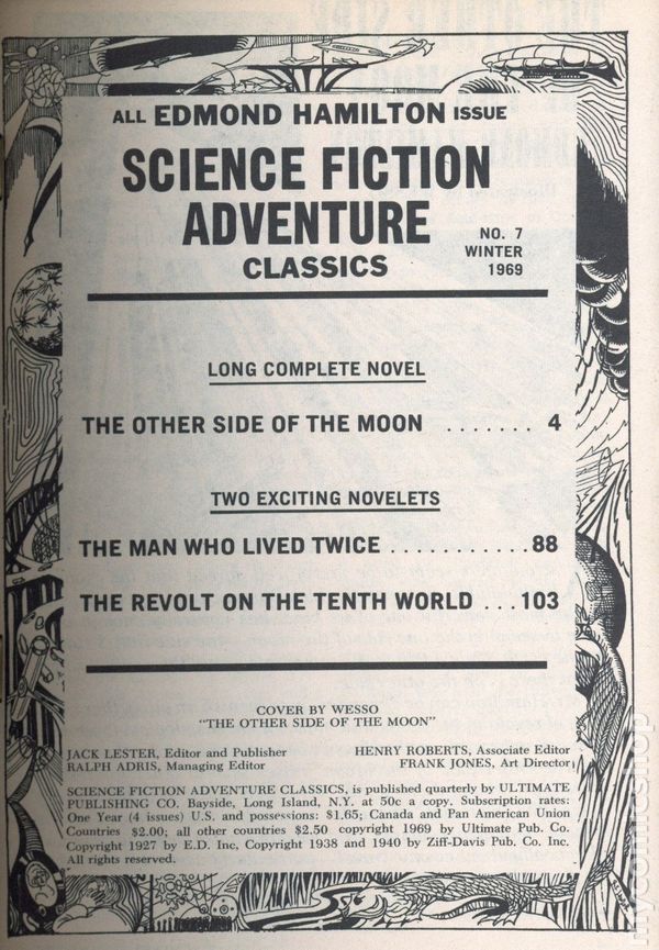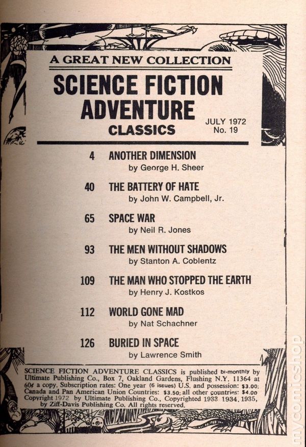 July 1972; whole number #19. Classic science fiction reprints: "Another Dimension" by George H. Sheer, "The Battery of Hate" by John W. Campbell, "Space War" by Neil R. Jones, "The Men Without Shadows" by Stanton A. Coblentz, "The Man Who Stopped the Earth" by Henry J. Kostkos, "World Gone Mad" by Nat Schachner, and "Buried in Space" by Lawrence Smith. 5.25-in. x 7.5-in.; black and white; 128 newsprint pages. Cover price $0.60.