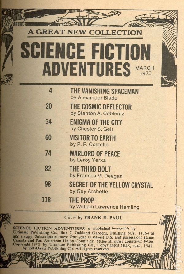 Not numbered. Dated March 1973. Classic SF pulp reprint stories by Richard S. Shaver (as Alexander Blade), Stanton A. Coblentz, Chester S. Geier, William P. McGivern (as P. F. Costello), Leroy Yerxa, Frances M. Deegan, Chester S. Geier (as Guy Archette), and William Lawrence Hamling. Cover price $0.60.