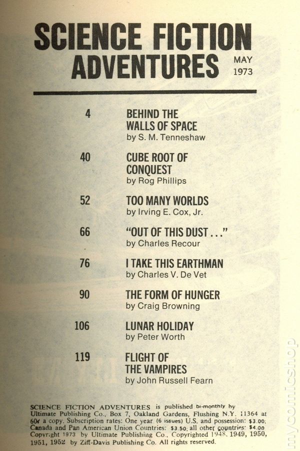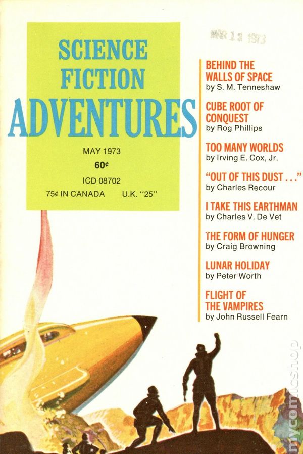 Not numbered. Dated May 1973. Classic SF pulp reprint stories by S. M. Tenneshaw, Rog Phillips, Irving E. Cox Jr, Henry Bott (as Charles Recour), Charles De Vet, Rog Phillips (as Craig Browning), Rog Phillips (as Peter Worth), and John Russell Fearn. NOTE: Title changes to Science Fiction Adventure Classics #25-32. Cover price $0.60.