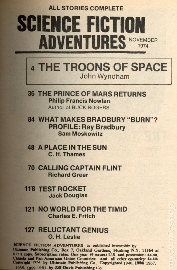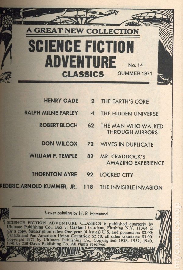 Not numbered. Dated November 1974. Final Issue of Ultimate Publishing's Classic SF series. SF pulp reprint stories by John Wyndam, Philip Francis Nowlan, Milton Lesser (as C. H. Thames), Robert Silverberg & Randall Garrett (as Richard Greer), Jack Douglas, Charles E. Fritch, and Henry Slesar (as O. H. Leslie). Cover price $0.75.