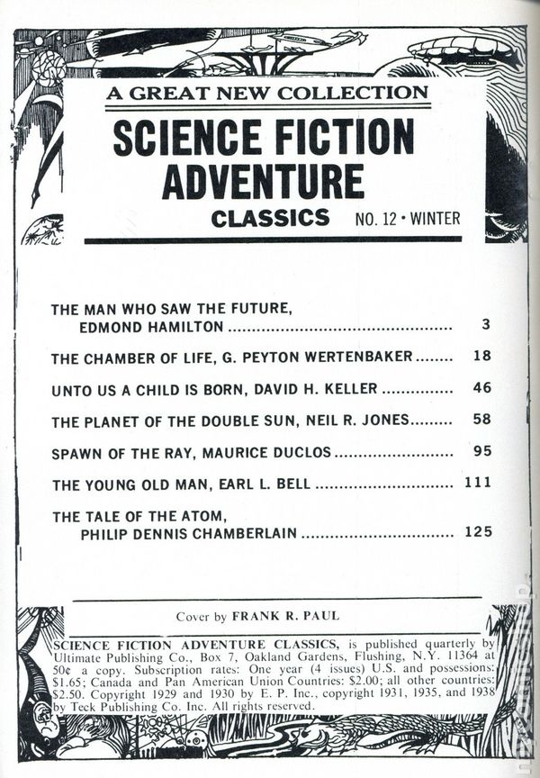 Winter 1970; whole number #12. Science Fiction stories by Edmond Hamilton, Peyton Wertenbaker, David H. Keller, Neil R. Jones, Maurice Duclos, Earl L. Bell, and Philip Dennis Chamberlain. 5.25-in. x 7.5-in.; black and white; 128 newsprint pages. Cover price $0.50.
