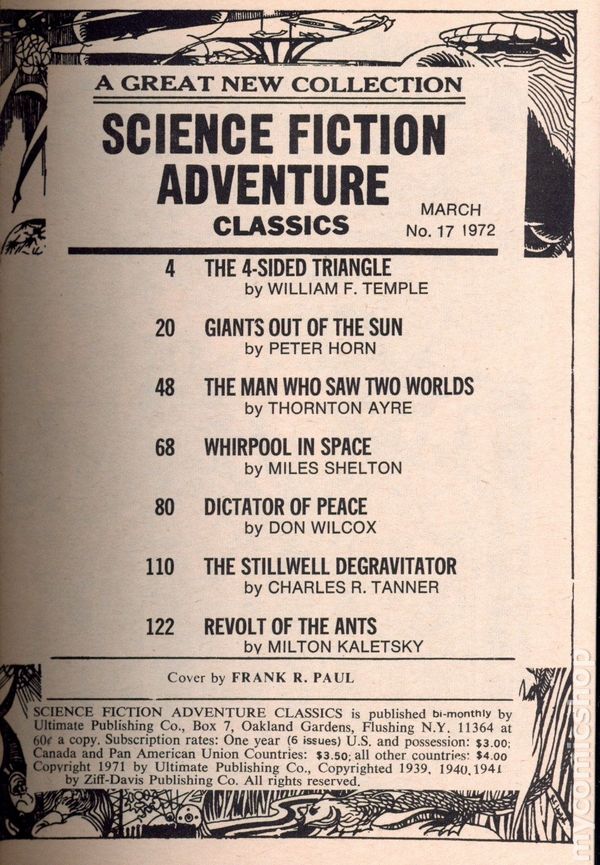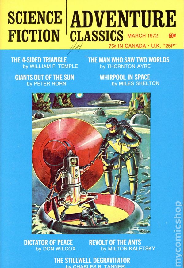 March 1972. Cover by Frank R. Paul. Classic SF reprints: "The 4-Sided Triangle" by William F. Temple, "Giants Out of the Sun" by Peter Horn, "The Man Who Saw Two Worlds" by Thornton Ayre, "Whirlpool in Space" by Miles Shelton, "Dictator of Peace" by Don Wilcox, "The Stilwell Degravitator" by Charles R. Tanner, and "Revolt of the Ants" by Milton Kaletsky. 5.25-in. x 7.5-in.; black and white; 132 newsprint pages. Cover price $0.60.
