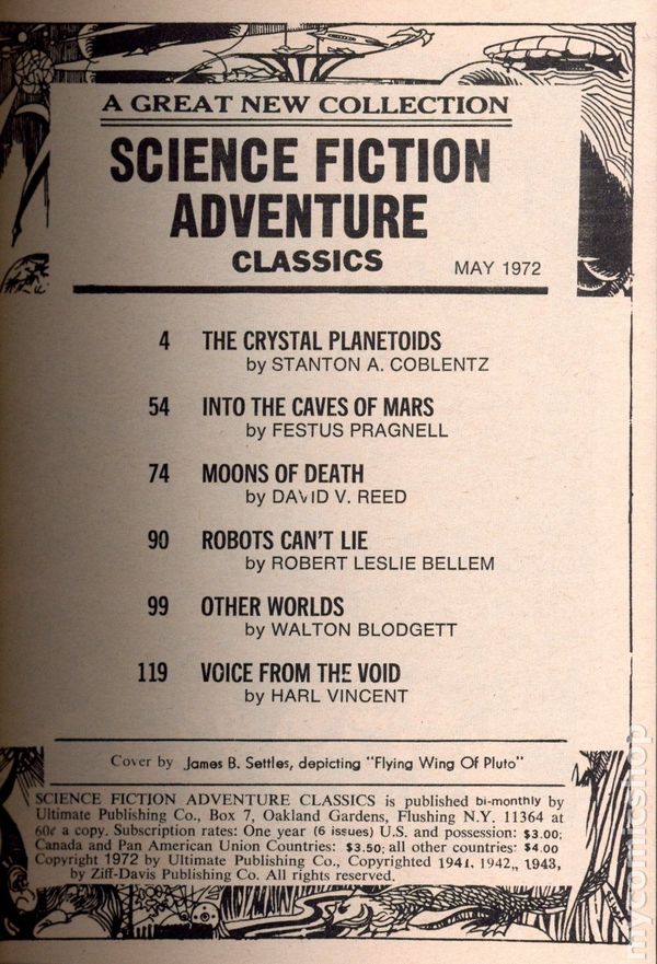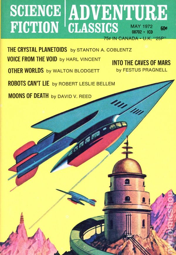 May 1972; whole number #18. Science fiction stories: "The Crystal Planetoids" by Stanton A. Coblentz, "Into the Caves of Mars" by Festus Pragnell, "Moons of Death" by David V. Reed, "Robots Can't Lie" by Robert Leslie Bellem, "Other Worlds" by Walton Blodgett, and "Voice From the Void" by Harl Vincent. Cover by James B. Settles. 5.25-in. x 7.5-in.; black and white; 128 newsprint pages. Cover price $0.60.