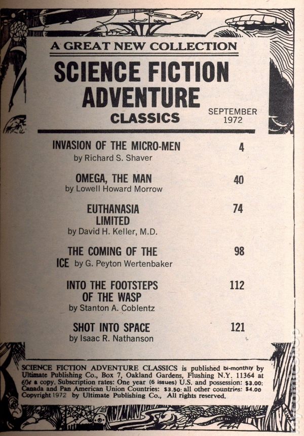 September 1972; issue not numbered. Science fiction stories: "Invasion of the Micro-Men" by Richard S. Shaver, "Omega, the Man" by Lowell Howard Morrow, "Euthanasia Limited" by David H. Keller M.D., "The Coming of the Ice" by G. Peyton Wertenbaker, "Into the Footsteps of the Wasp" by Stanton A. Coblentz, and "Shot Into Space" by Isaac R. Nathanson. 5.25-in. x 7.5-in.; black and white; 128 newsprint pages. Cover price $0.60.