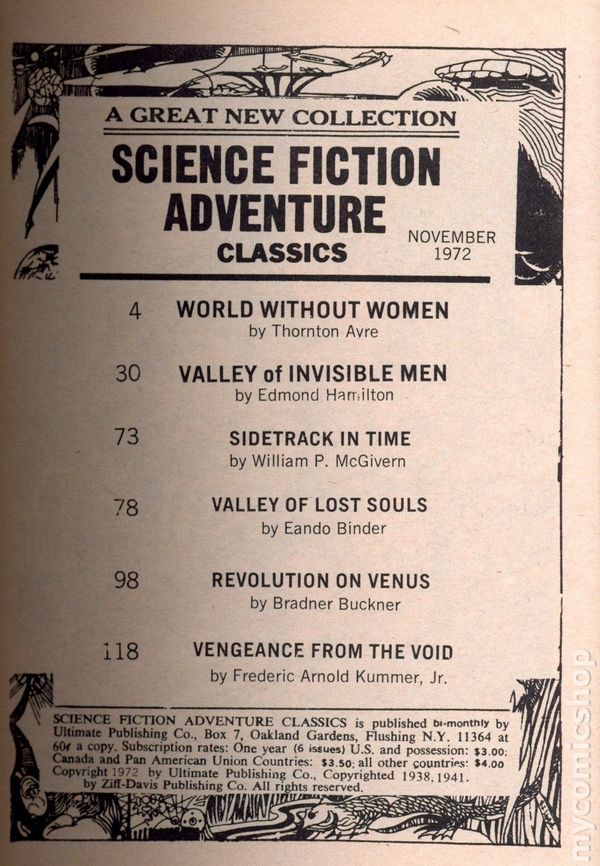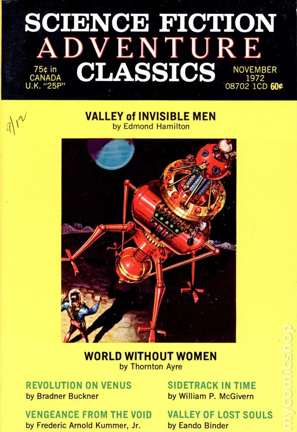 November, 1972; issue not numbered. Science fiction stories: "Valley of the Invisible Men" by Edmond Hamilton, "World Without Women" by Thornton Ayre, "Revolution on Venus" by Bradner Buckner, "Vengeance from the Void" by Frederic Arnold Kummer, Jr., "Sidetrack in Time" by William P. McGivern, and "Valley of Lost Souls" by Eando Binder. Softcover Digest, 5" x 7.5", 130 pages, B&W. Cover price $0.60.