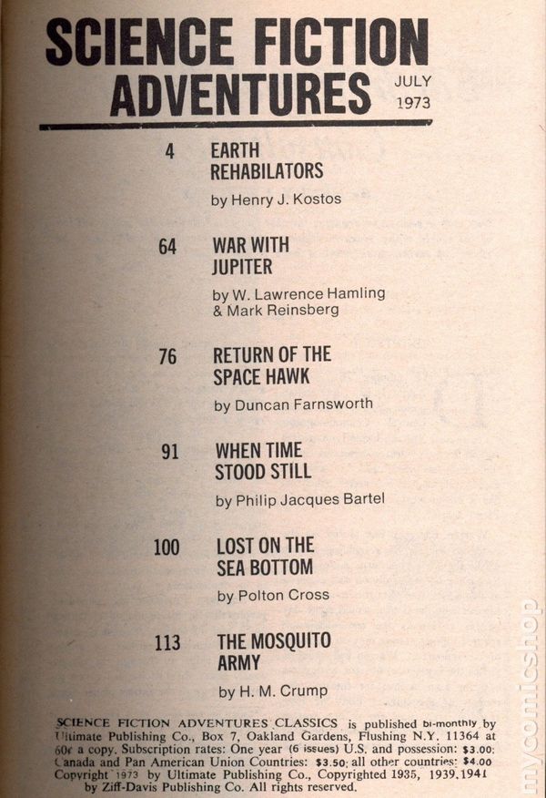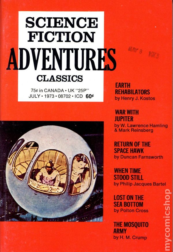 July 1973. Science fiction stories: "Earth Rehabilatators" by Henry J. Kostos, "War with Jupiter" by W. Lawrence Hamling and Mark Reinsberg, "Return of the Space Hawk" by Duncan Farnsworth, "When Time Stood Still" by Phillip Jacques Bartel, "Lost on the Sea Bottom" by Polton Cross, and "The Mosquito Army" by H.M. Crump. Softcover, Pulp Digest. 5-in x 7 1/2-in. 130 Pages, B&W. Cover price $0.60.
