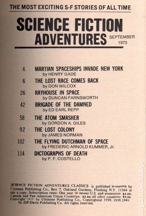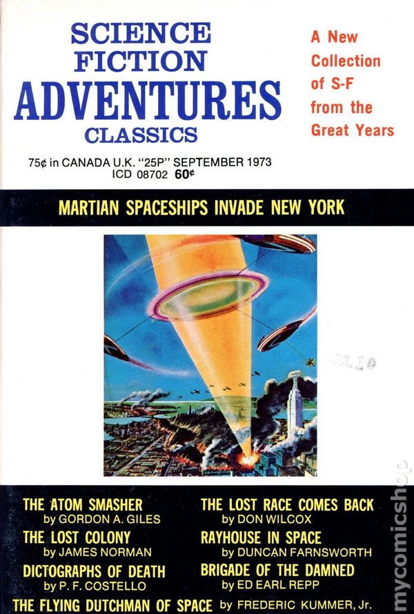 September 1973. Classic science fiction reprints: "Martian Spaceships Invade New York" by Henry Gade, "The Lost Race Comes Back" by Don Wilcox, "Rayhouse in Space" by Duncan Farnsworth, "Brigade of the Damned" by Ed Earl Repp, "The Atom Smasher" by Gordon A. Giles, "The Lost Colony" by James Norman, "The Flying Dutchman of Space" by Frederic Arnold Kummer Jr, and "Dictographs of Death" by P. F. Costello. Softcover, Pulp Digest. 5-in x 7 1/2-in. 130 Pages, B&W. Cover price $0.60.