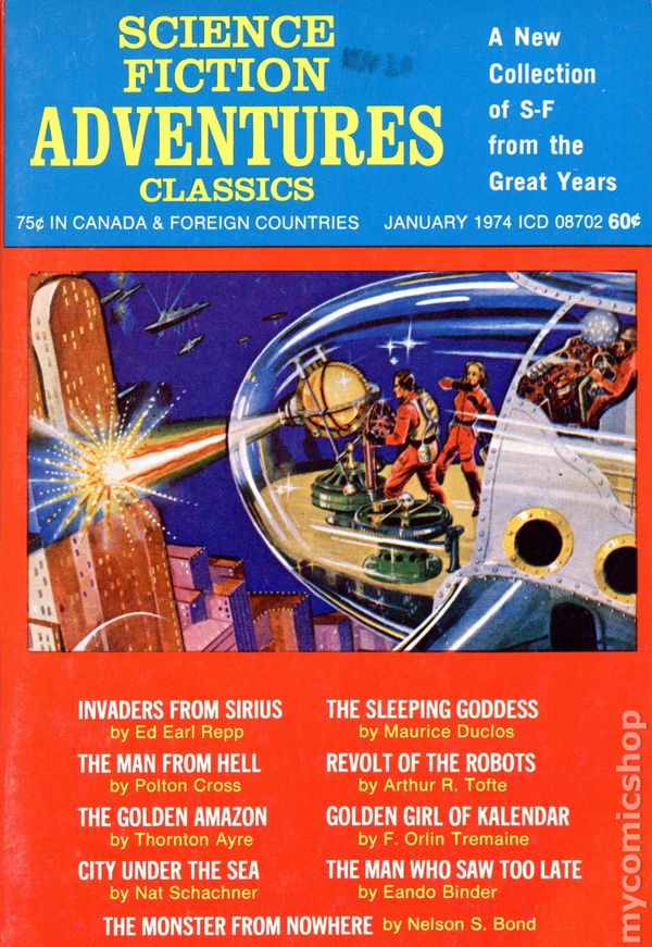 Not numbered. Dated September 1974. Title continues from Science Fiction Adventure Classics #32. Classic SF pulp reprint stories by Murray Leinster, Jack Sharkey, Harlan Ellison, Milton Lesser (as C. H. Thames), Adam Chase, Ed Earl Repp, and Randall Garrett. Cover price $0.75.