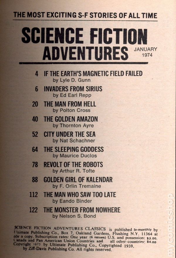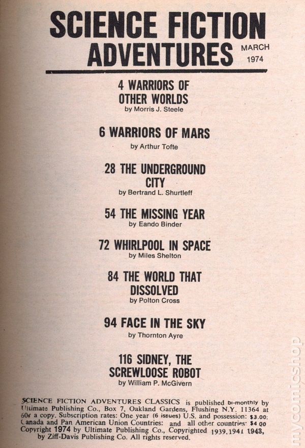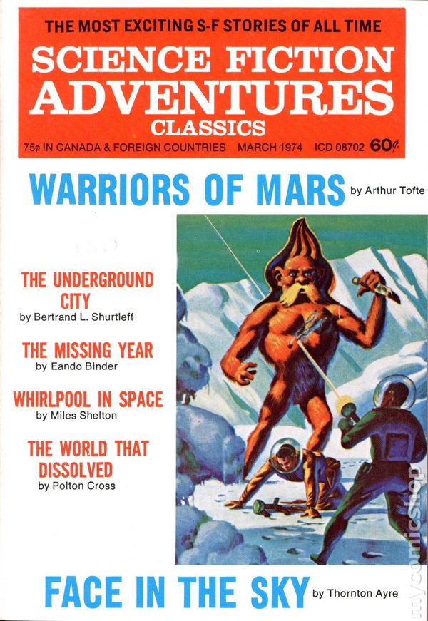 March 1974. Science fiction stories: "Warriors of Other Worlds" by Morris J. Steele, "Warriors of Mars" by Arthur Tofte, "The Underground City" by Bertrand L. Shurtleff, "The Missing Year" by Eando Binder, "Whirlpool in Space" by Miles Shelton, "The World That Dissolved" by Polton Cross, "Face in the Sky" by Thornton Ayre, and "Sydney, the Screwloose Robot" by William P. McGivern. 5.25-in. x 7.5-in.; black and white; 128 newsprint pages. Cover price $0.60.