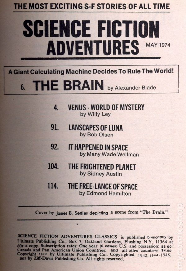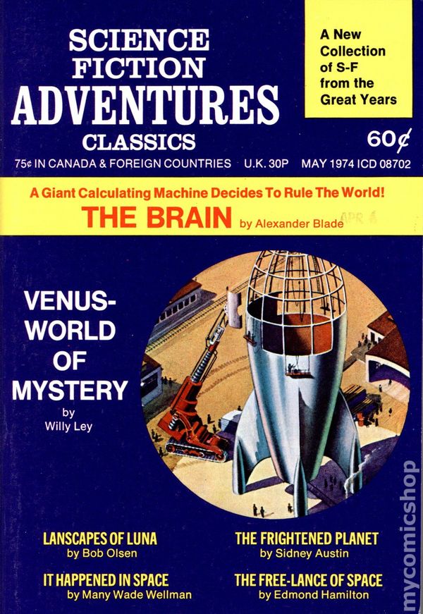 May 1974. Science fiction stories: "The Brain" by Alexander Blade, "Venus--World of Mystery" by Willy Ley, "Lanscapes of Luna" by Bob Olsen, "It Happened in Space" by Manly Wade Wellman, "The Frightened Planet" by Sidney Austin, and "The Free-Lance of Space" by Edmond Hamilton. Cover by James B. Settles. 5.25-in. x 7.5-in.; black and white; 128 newsprint pages. Cover price $0.60.