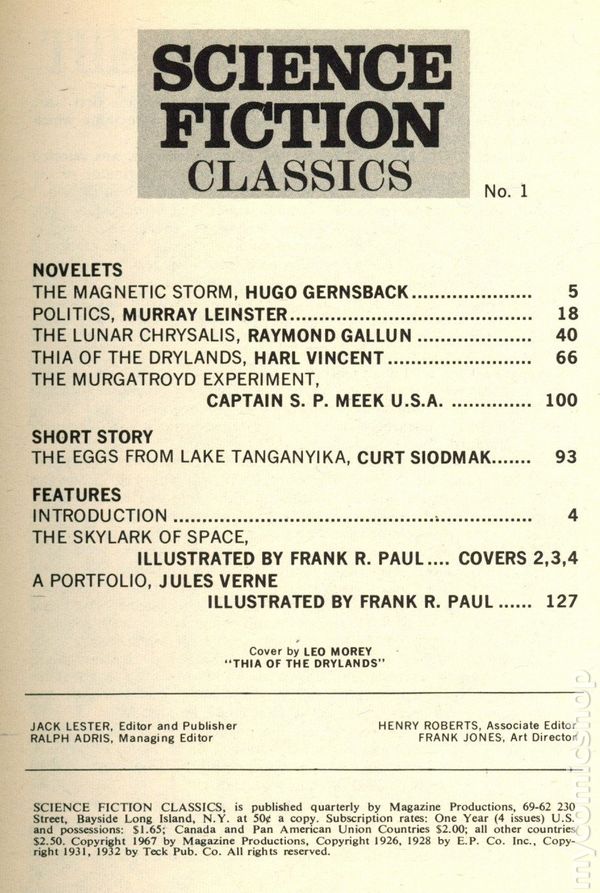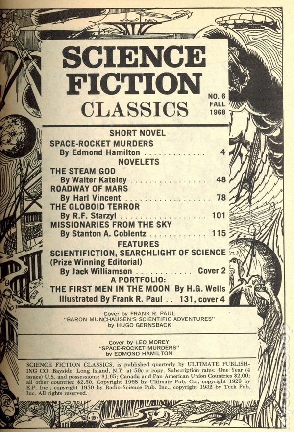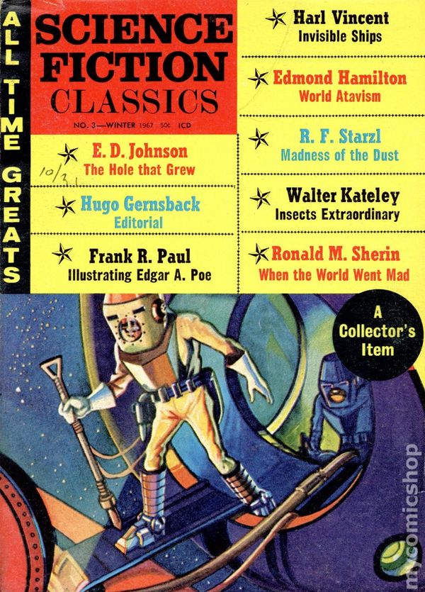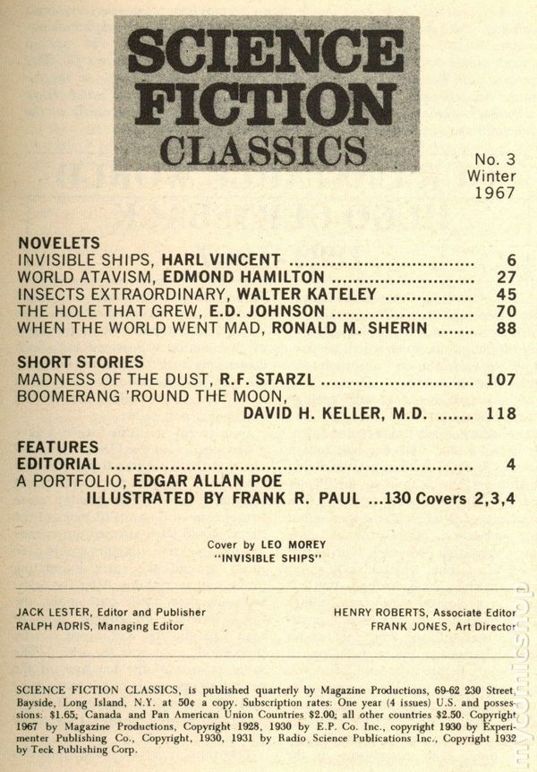 Winter 1967. Cover by Leo Morey. Stories by Harl Vincent, Edmond Hamilton, Walter Kateley, E. D. Johnson, Ronald M. Sherin, R. F. Starzl, David H. Keller. Illustrations by Frank R. Paul, Leo Morey, H. W. Wesso. 5-3/8 in. x 7-3/4 in.; black and white; 130 newsprint pages. Cover price $0.50.