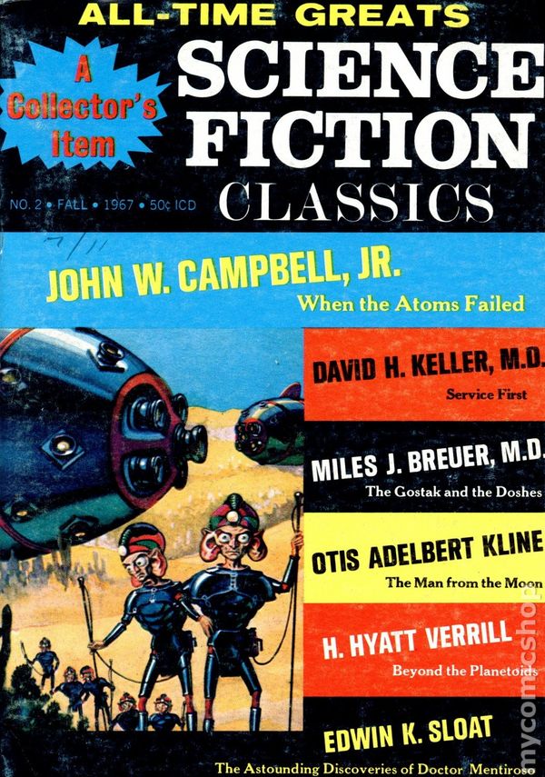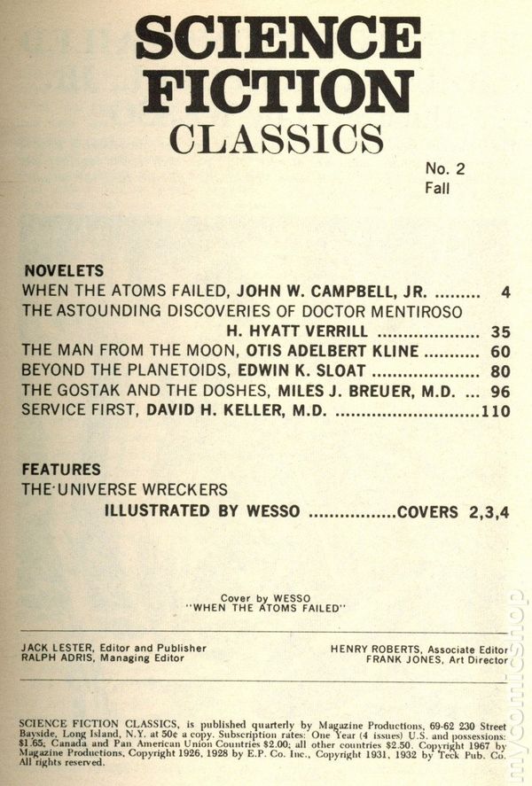 Fall 1967. Science fiction stories: "When the Atoms Failed" by John W. Campbell Jr., "The Astounding Discoveries of Doctor Mentiroso" by H. Hyatt Verrill, "The Man From the Moon" by Otis Adelbert Kline, "Beyond the Planetoids" by Edwin K. Sloat, "The Gostak and the Doshes" by Miles J. Breuer M.D., and "Service First" by David H. Keller M.D. Illustrations and cover by Wesso. 5-3/8 in. x 7-3/4 in.; black and white; 128 newsprint pages. Cover price $0.50.