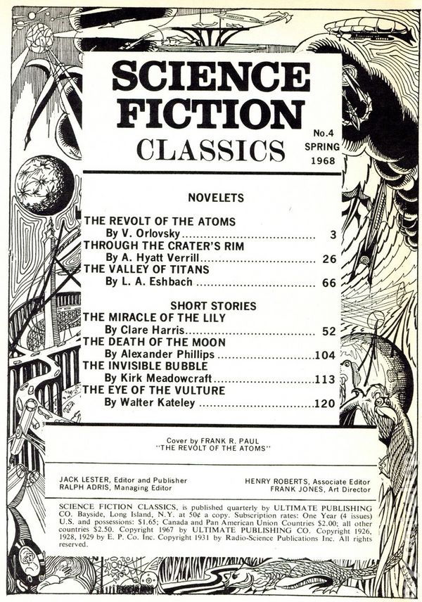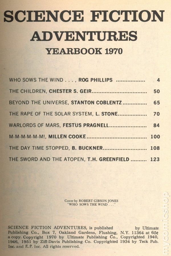 January, 1970, Number 1. Cover by Robert G. Jones. Classic Science fiction reprints by Rog Phillips, Chester S. Geir, Stanton Coblentz, L. Stone, Festus Pragnell, Millen Cooke, B. Buckner, T. H. Greenfield. 5 1/4-in. x 7 1/2-in.; black and white; 128 pages. Cover price $0.60.