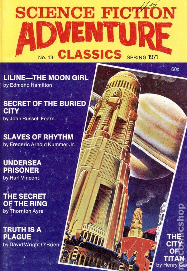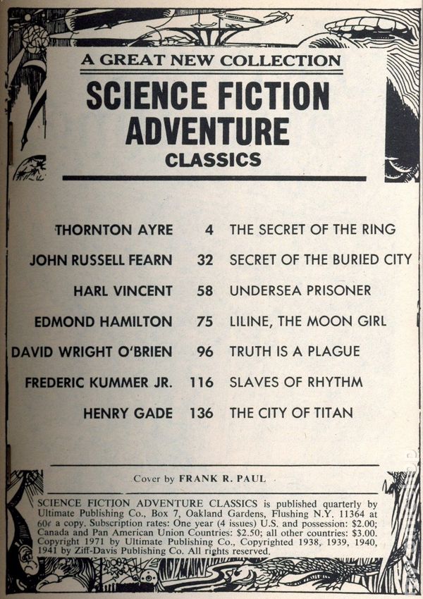 Fall 1971. Cover by Robert Fuqua. Classic SF reprints - "Enchantress of Lemuria" by Stanton A. Coblentz, "When the Darkness Came" by William De Lisle, "Lunar Vengeance" by Thornton Ayre, "Madcap of Mars" by Festus Pragnell, and "Valley of the Sun" by Leroy Yerxa. 5.25-in. x 7.5-in.; black and white; 132 newsprint pages. Cover price $0.60.