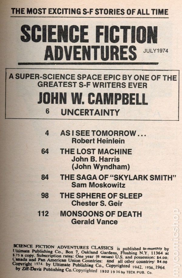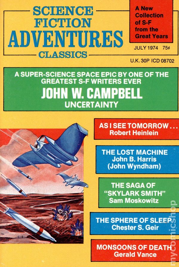 July 1974. Science fiction stories: "Uncertainty" by John W. Campbell, "As I See Tomorrow" by Robert Heinlein, "The Lost Machine" by John Wyndman (as "John B. Harris"), "The Sage of Skylark Smith" by Sam Moskowitz, "The Sphere of Sleep" by Chester S. Geir, and "Monsoons of Death" by Gerald Vance. 5-in x 7 1/2-in, 128 Pages, B&W. Cover price $0.75.