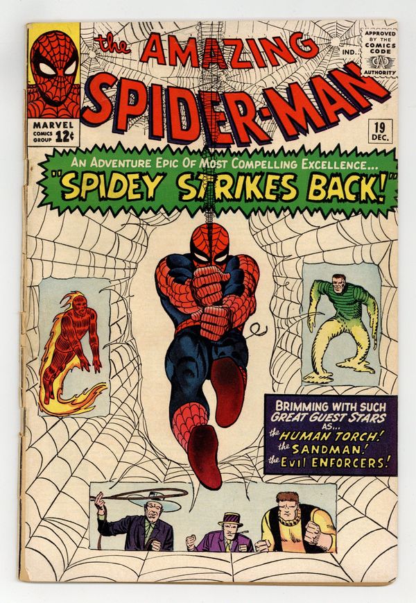 Starts Jan 19 Cover art by Steve Ditko. Spidey Strikes Back!, script by Stan Lee, art by Steve Ditko; Sandman and the Enforcers capture the Human Torch; When Spider-Man questions a stool pigeon and learns of this he comes to the aid of the Human Torch. Second appearance of Ned Leeds (future Hobgolin) in this issue (first time his name is revealed). Reprinted in Marvel Tales # 14 and 157. 36 pgs. $0.12. Cover price $0.12.