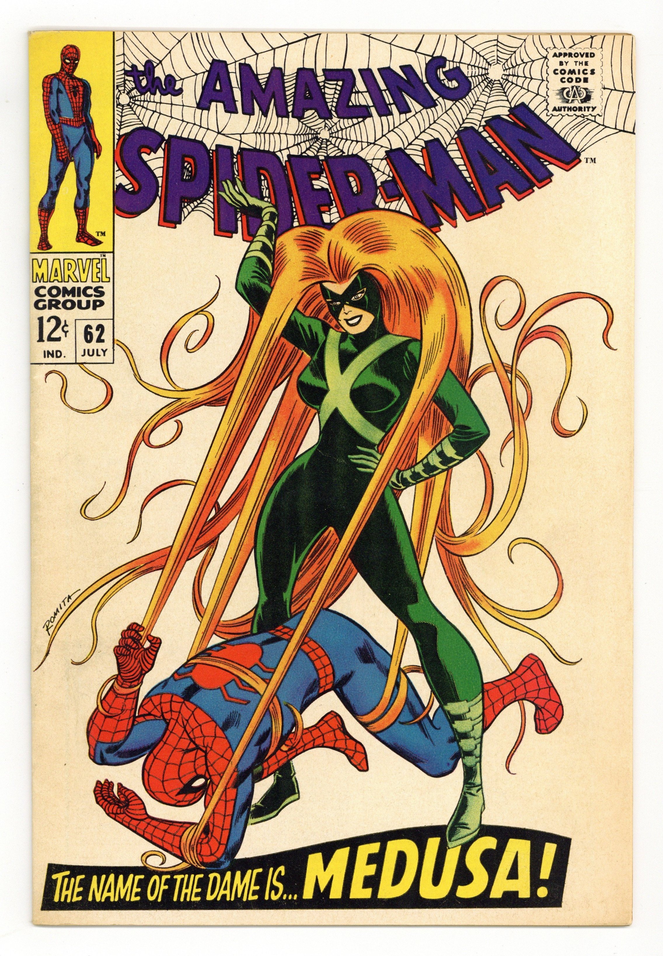 Ends Dec 8 7:15 PM CST Bid History 10 bids Current Bid $150 Your Secret Max Bid If you'd like to bid, please log in or register. "Make Way for Medusa!" Guest-starring Medusa. Script by Stan Lee. Art by John Romita (layouts) and Don Heck (pencils). Inks by Mike Esposito (as Mickey Demeo). Cover by John Romita. The inhuman with the living red hair comes to New York City! Medusa is on a mission from Black Bolt to see how regular everyday people might relate to the Inhumans -- if they choose to rejoin society someday. Unfortunately, one of the first persons Madame Medusa meets...is the CEO of a hair spray company! The duplicitous executive tricks Spider-Man and Medusa into fighting one another (as shown on the fantastic cover) -- to support his advertising campaign! Eventually, the web-slinger and Medusa realize what's happening...and they turn the tables on the shady CEO. Cameo appearances by Captain Stacy, Gwen Stacy, Mary Jane Watson, J. Jonah Jameson, Norman Osborn, and Harry Osborn. (Notes: Spectacular Spider-Man (1968 Magazine) #1 was also published this month. The letters page includes a letter from Mark Lamberti -- long-time friend of Lone Star Comics. This issue was reprinted in Marvel Tales #45.) 36 pages. Cover price $0.12.