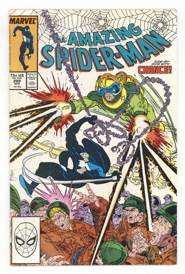 Starts Jan 19 Direct Edition. "Survival of the Hittist!" Part 2 of 2. Script by David Michelinie. Pencils by Todd McFarlane. Inks by Bob McLeod. Cover by Todd McFarlane. After their waterfront arms theft goes awry, the Life Foundation turns the tables on Chance! The mysterious survivalist group abducts the mercenary and takes him to their secret headquarters in northern New Jersey! But thanks to a well-placed spider tracer, the web-slinger infiltrates the foundation's secluded colony the next day...and rescues Chance! So now the adversaries of 24 hours ago suddenly become allies to avoid death...courtesy of the Life Foundation! First appearance (and cameo on the last page) by Venom. Cameo appearances by Eddie Murphy, Paul Schaffer, and Joe Robertson. Last 75¢ issue. 36 pages, full color. (Note: Chance returns in Amazing Spider-Man 336.) Cover price $0.75.