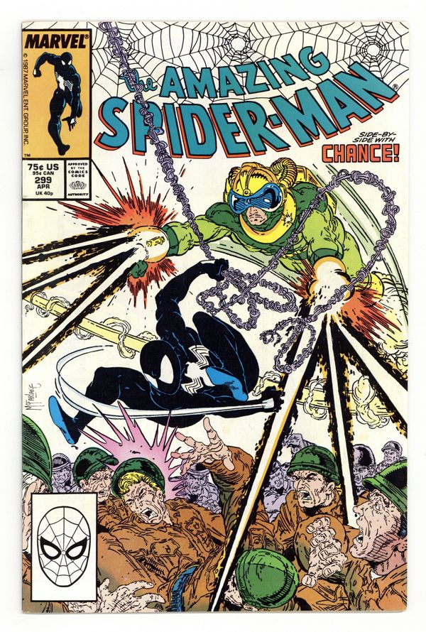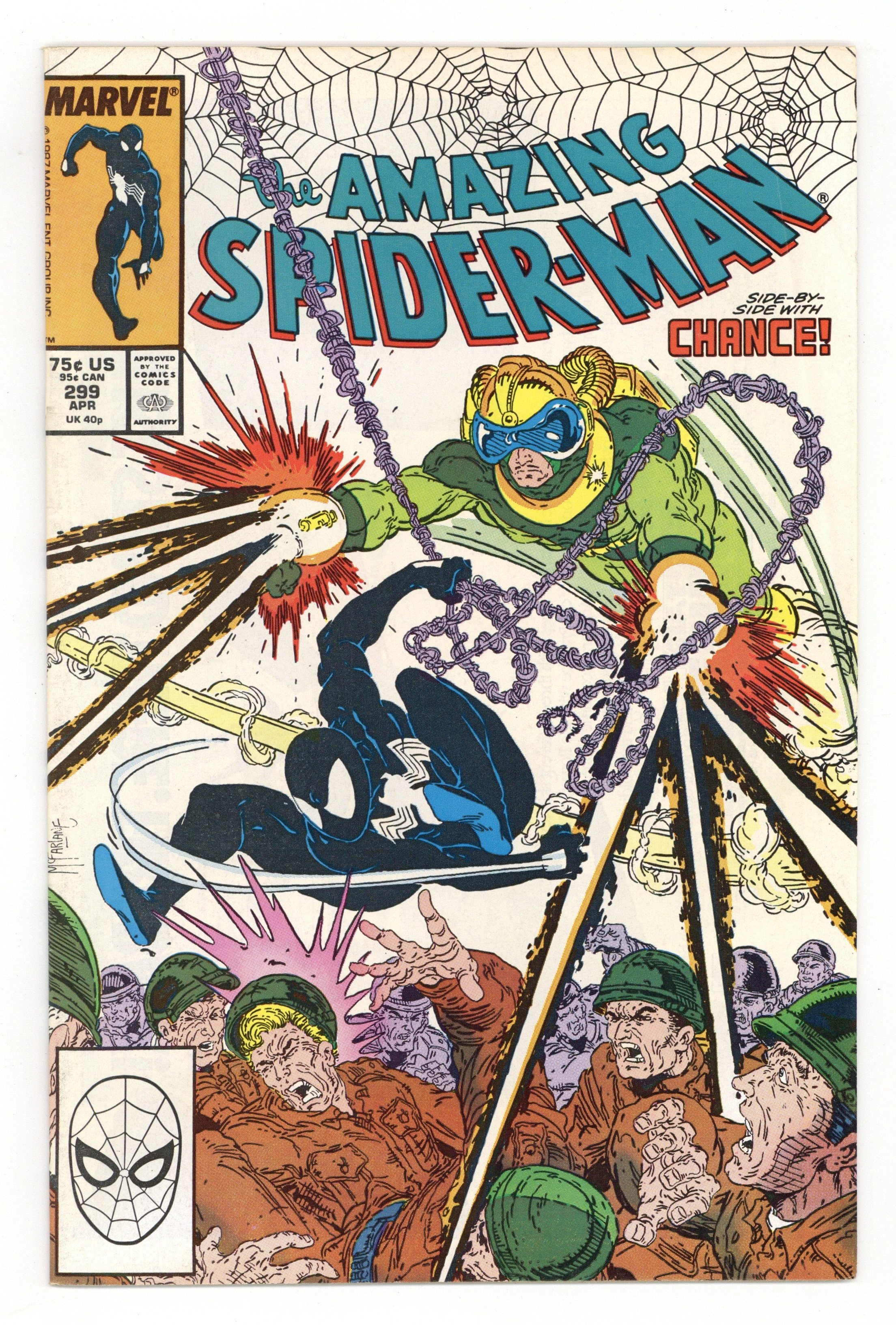 Ends Dec 8 7:21 PM CST Bid History 11 bids Current Bid $77 Your Secret Max Bid If you'd like to bid, please log in or register. Direct Edition. "Chance Encounter!" Part 1 of 2. Script by David Michelinie. Pencils by Todd McFarlane. Inks by Bob McLeod. Cover by Todd McFarlane. Chance is back in business and working a new job for the Life Foundation! The clandestine organization wants Chance to steal an arms shipment coming into the west side docks! That should be a piece of cake for the high-flying mercenary! However, the Daily Bugle dispatches an undercover photographer to observe the delivery! And beneath the moonlit sky, fireworks explode when Chance and the Amazing Spider-Man throw down on the docks! First appearance (and cameo on the last page) by Eddie Brock (aka Venom). First appearance of Carlton Drake of the Life Foundation. Cameo appearances by Mary Jane Watson, Joy Mercado, and Joe Robertson. (Notes: Chance previously appeared in Web of Spider-Man 15. This issue begins Todd McFarlane's 2-year run as the penciler of the Amazing Spider-Man series.) 36 pages. Cover price $0.75.