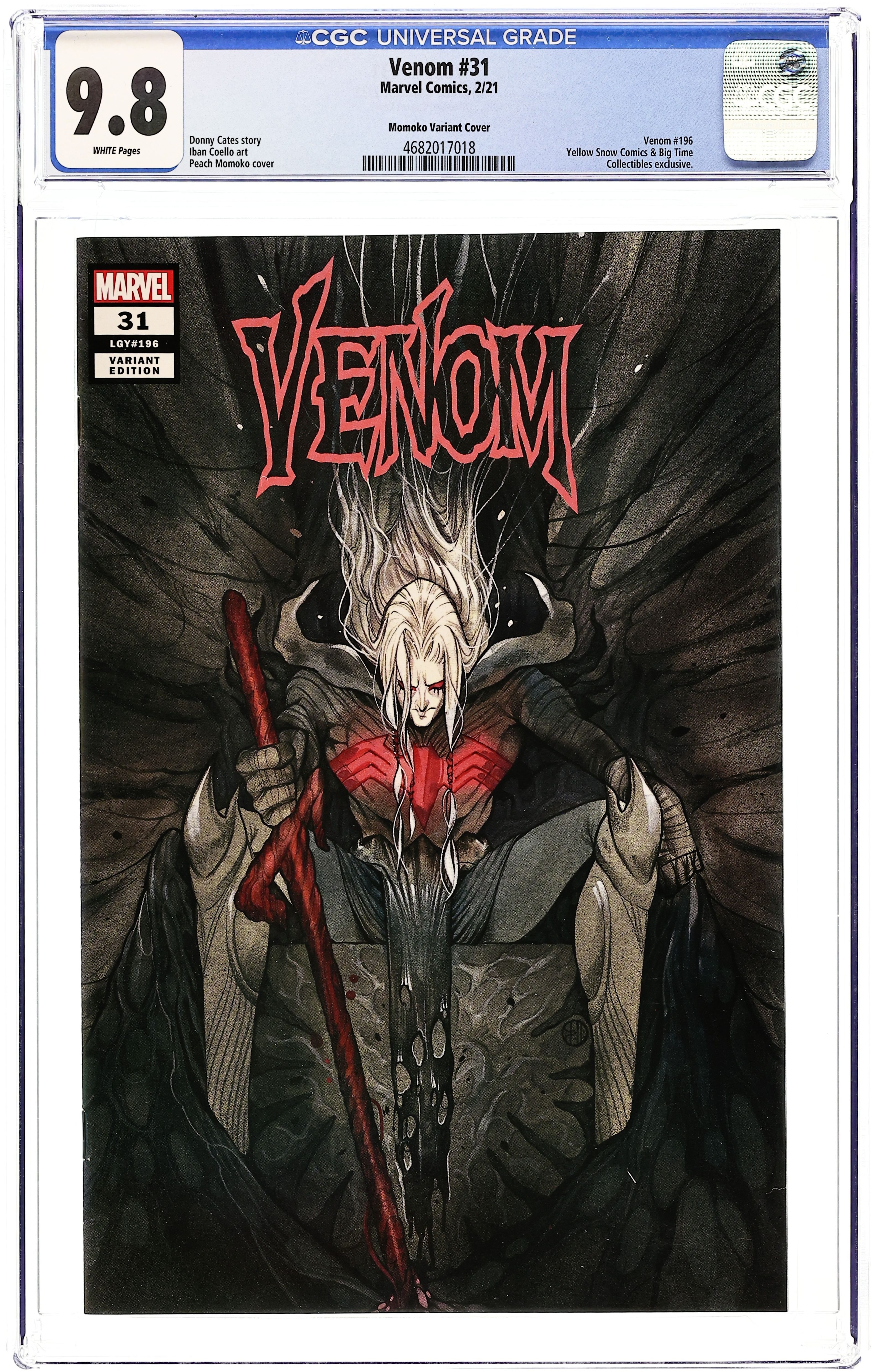 Starts May 25 Big Time Collectibles and Yellow Snow Comics Exclusive Cover by Peach Momoko. Written by Donny Cates. Art by Iban Coello. KING IN BLACK ARRIVES! KING IN BLACK ARRIVES! What happens to Eddie Brock when he finally comes face to face with the lord of the abyss, the KING IN BLACK: KNULL? 28 pages, full color. Rated T+