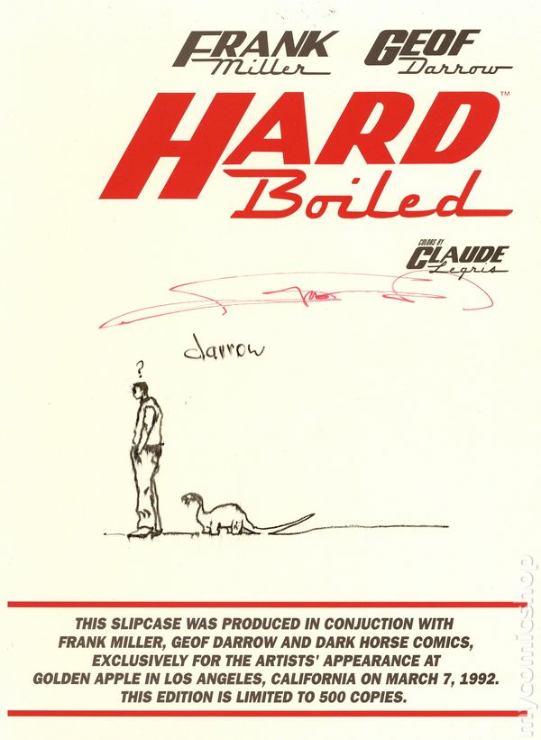 Signed Hard Boiled Slipcase containing all three issues of the series, each signed by Frank Miller & Geof Darrow - Limited to 500 copies. This slipcase was produced in conjunction with Frank Miller, Geof Darrow and Dark Horse Comics, Exclusively for the Artists' Appearance at Golden Apple in Los Angeles, California on March 7, 1992.