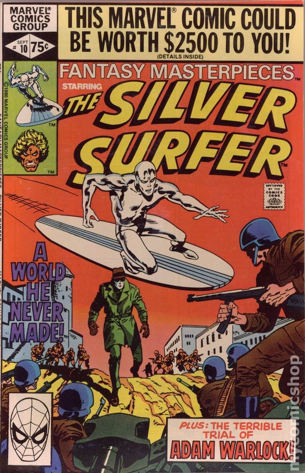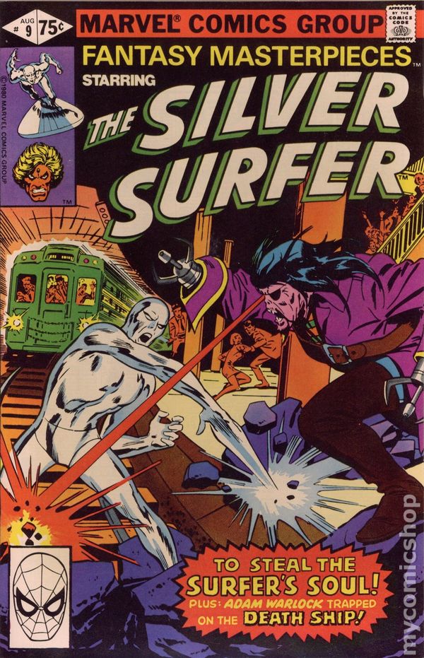 Direct Edition. Reprints Silver Surfer (1969 1st Series) #14. "The Surfer and the Spider!" Guest-starring Spider-Man. Captain America cameo. Written by Stan Lee. Art by John Buscema and Dan Adkins. A misunderstanding sets the Amazing Spider-Man against the awesome power of the Silver Surfer. Includes the back-up tale "How Strange my Destiny - Escape into the Inner Prison: Part 2!" Starring Adam Warlock. Originally presented in Warlock (1st Series) #11. Story by Jim Starlin. Art by Jim Starlin and Steve Leialoha. Adam Warlock fights side-by-side with the despot, Thanos, against the unparalleled might of the Magus and his hordes. Cover price $0.50.