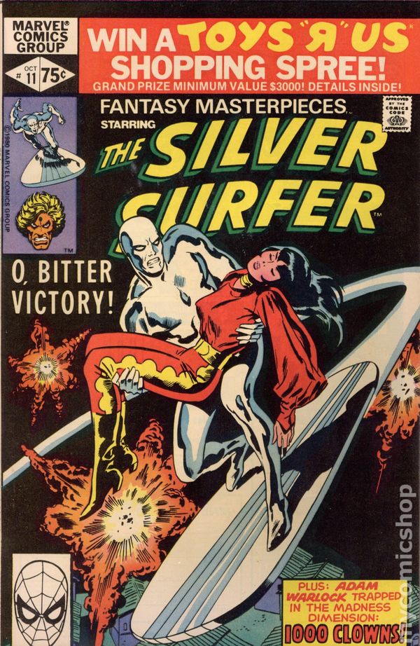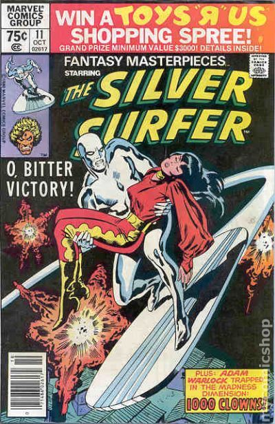 Direct Edition. Reprints Silver Surfer (1969 1st Series) #11. "O, Bitter Victory!" Written by Stan Lee. Pencils by John Buscema. Inks by Dan Adkins. When a madman puts the Silver Surfer's true love's life in jeopardy, Norrin Radd does the only thing he can...send her back to Zen-La where she'll be safe, and perhaps lost to him forever. Includes the back-up tale "1000 Clowns!" Starring Adam Warlock. Originally presented in Strange Tales (1951-1976 1st Series) #181. Written by Jim Starlin. Pencils by Jim Starlin. Inks by Al Milgrom. Even the enigmatic Warlock can become perplexed by a cadre of cosmic jo-jos. Cover price $0.75.