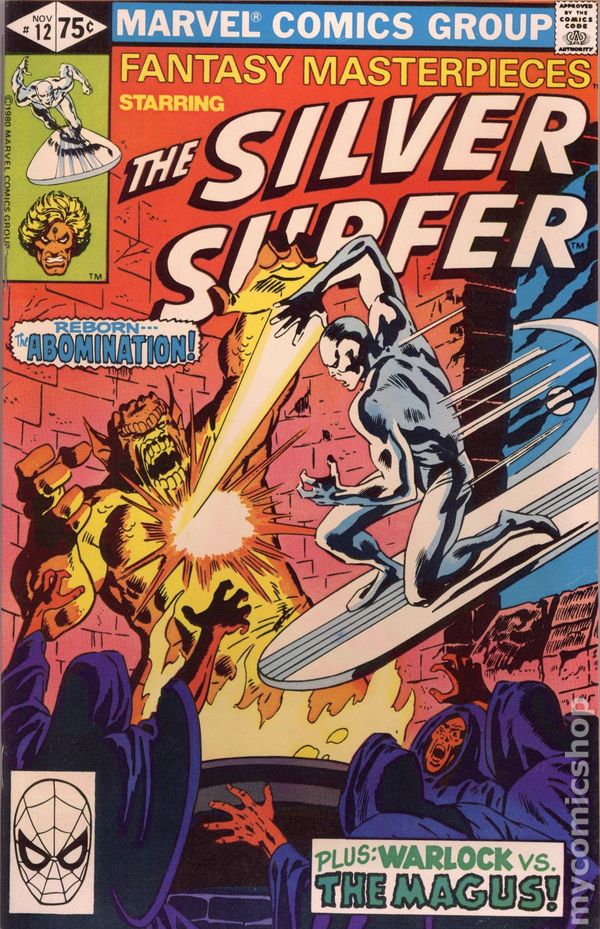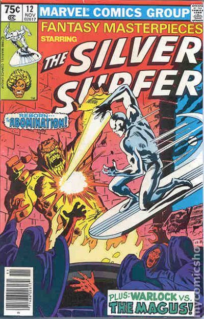 Direct Edition. Reprints Silver Surfer (1969 1st Series) #12. "Gather, Ye Witches!" Written by Stan Lee. Pencils by John Buscema. Inks by Dan Adkins. Can even the Silver Surfer hope to survive an encounter with the awesome might of the Abomination, a creature whose strength rivals that of the Incredible Hulk himself? Includes the back-up tale "The Infinity Effect!" Starring Adam Warlock. Originally presented in Warlock (1972-1976 1st Series) #9. Written by Jim Starlin. Pencils by Jim Starlin. Inks by Steve Leialoha. Adam Warlock must face off with his evil elf, the Magnus! Cover price $0.75.