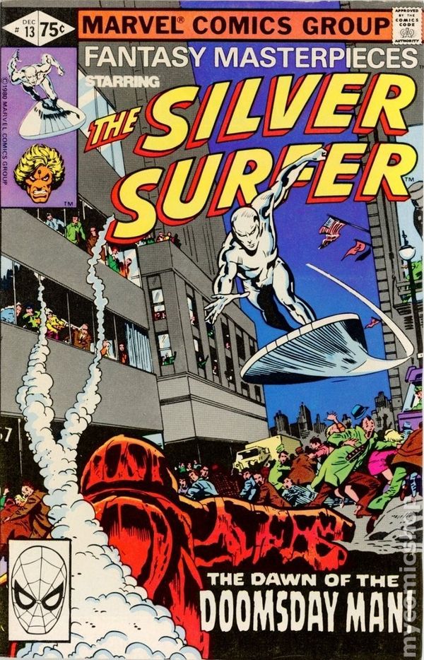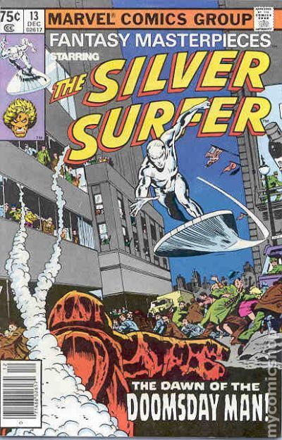 Direct Edition. Reprints Silver Surfer (1969 1st Series) #13. "The Dawn of the Doomsday Man!" Written by Stan Lee. Art by John Buscema and Dan Adkins. The ground rumbles and the citizens of New York City tremble in fear as the monstrosity known as the Doomsday Man rise from the bowels of the earth. Only the Silver Surfer, a being whom the people of Earth have ridiculed and alienated time and again, can save them now. Includes the back-up tale "How Strange my Destiny - The Price: Part 1!" Starring Adam Warlock. Originally presented in Warlock (1972-1976 1st Series) #10. Story by Jim Starlin. Art by Jim Starlin and Steve Leialoha. Will Adam Warlock do the unthinkable and team-up with Thanos, the Mad Titan, in order to stop the Magus? Cover price $0.75.