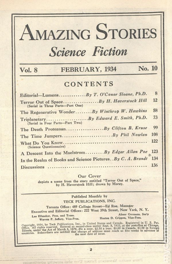 February 1934. Canadian Reprint Edition (identical to the US magazine except for the overprint "Printed in Canada on Canadian Paper" on the front cover). Cover and illustrations by Leo Morey. 6.75-in. x 9.75-in.; black and white; 144 newsprint pages Cover price $0.25.