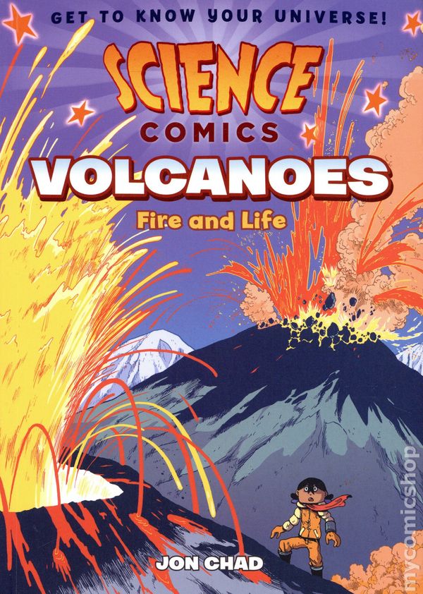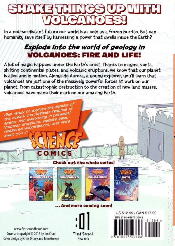 2nd and later printings. Story and art by Jon Chad. Get ready to explore the depths of the ocean, the farthest reaches of space, and everything in between! Volcanic eruptions, vampire bats, feathered velociraptors, and more await you in SCIENCE COMICS. In a not-so-distant future our world is as cold as a frozen burrito. But can humanity save itself by harnessing a power that dwells inside the Earth? Explode into the world of geology in Volcanoes: Fire and Life! A lot of magic happens under the Earth's crust. Thanks to magma vents, shifting continental plates, and volcanic eruptions, we know that our planet is alive and in motion. Alongside Aurora, a young explorer, you'll learn that volcanoes are just one of the massively powerful forces at work on our planet. From catastrophic destruction to the creation of new land masses, volcanoes have made their mark on our amazing Earth. Softcover, 6-in. x 9-in., 128 pages, full color. All Ages Cover price $12.99.