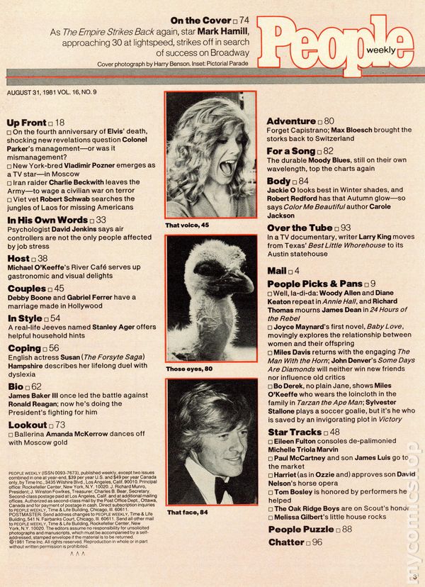 August 31, 1981. Star Wars cover and article, Mark Hamill approaches 30, James Baker III led a battle against Ronald Reagan, Michael O'Keeffe's restaurant, and more. 8.25-in. x 11-in.; black and white; 96 pages. Cover price $0.95.