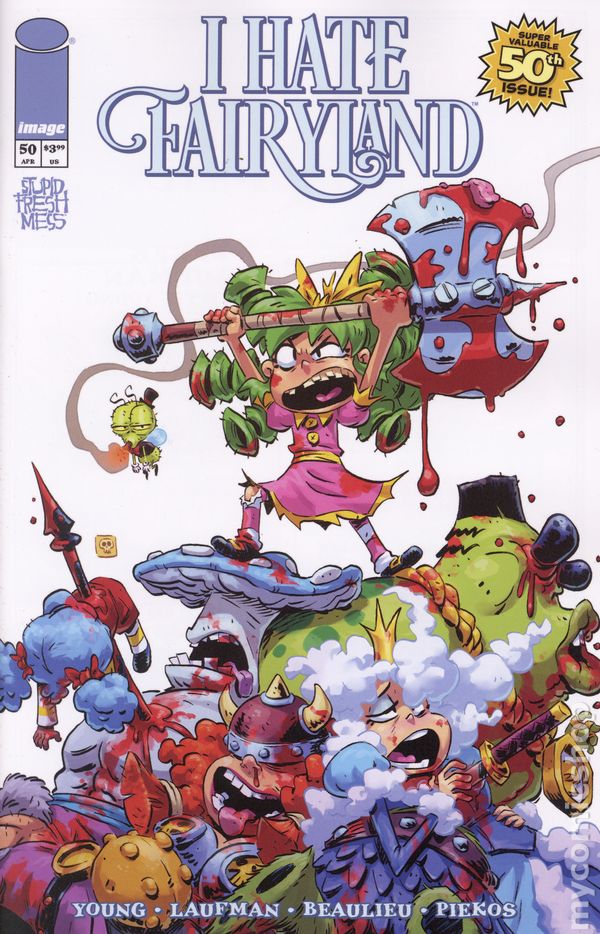 (W) Skottie Young (A) Derek Laufman (CA) Brett Bean It's an issue ten years in the making... That's right, muffin fluffers: I HATE FAIRYLAND is hitting the monumental milestone Issue #50! Join Skottie Young, Derek Laufman, the IHF team and a roster of the best cover artists in the industry for a celebration of all things Gert, and a tantalizing tease at the NEXT ten years of our cutesy green-haired psycho's adventures in Fairyland… Cover price $3.99.