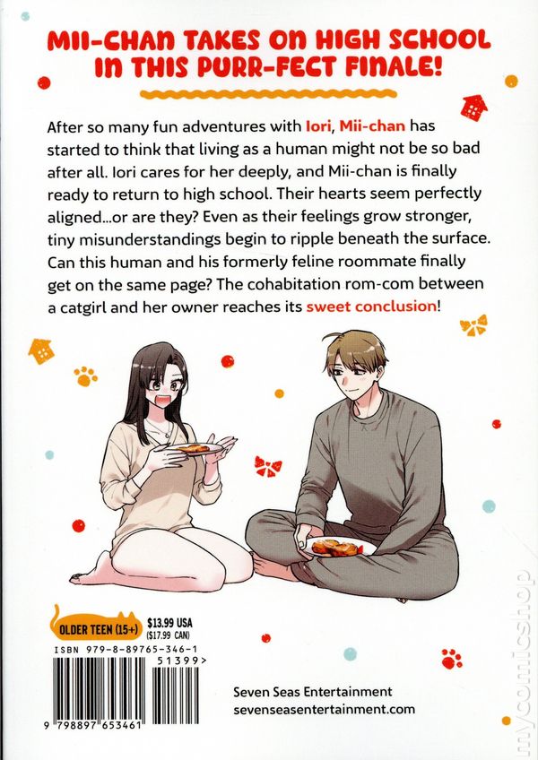 Volume 4 - 1st printing. Story and art by Waka Takase. Translated by David Musto. MII-CHAN TAKES ON HIGH SCHOOL IN THIS PURR-FECT FINALE! After so many fun adventures with Iori, Mii-chan has started to think that living as a human might not be so bad after all. Iori cares for her deeply, and Mii-chan is finally ready to return to high school. Their hearts seem perfectly aligned…or are they? Even as their feelings grow stronger, tiny misunderstandings begin to ripple beneath the surface. Can this human and his formerly feline roommate finally get on the same page? The cohabitation rom-com between a catgirl and her owner reaches its sweet conclusion! Softcover, 5-in. x 7-in., 192 pages, B&W. Older Teen (15+) Cover price $13.99.