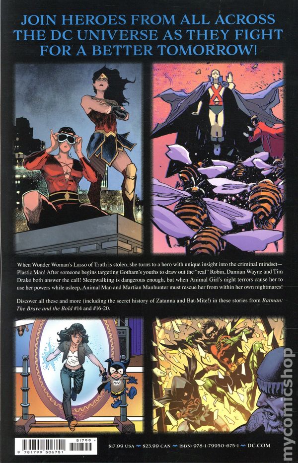 1st printing. Collects Stories from Batman: The Brave and the Bold (2023 DC) #14 and 16-20. Written by Dave Wielgosz, Troy Peteri, Ty Templeton, Cavan Scott, Stephanie Williams, Jeremy Adams, Brendan Hay, Marguerite Sauvage, Hassan Otsmane-Elhaou, Michael W. Conrad, and Simone Di Meo. Art by Nikola Cizmesija, David Baldeon, Ty Templeton, Travis Mercer, Asiah Fulmore, Laura Braga, Marco Santucci, Marguerite Sauvage, Tom Derenick, Chris Mitten, and Simone Di Meo. Cover by Simone Di Meo. Back Cover by Nikola Cizmesija, Ty Templeton, Chris Mitten, and Marco Santucci. Join heroes from all across the DC Universe as they fight for a better tomorrow! When Wonder Womans Lasso of Truth is stolen, she turns to a hero with unique insight into the criminal mindset – Plastic Man! After someone begins targeting Gothams youths to draw out the real Robin, Damian Wayne and Tim Drake both answer the call! Sleepwalking is dangerous enough, but when Animal Girls night terrors cause her to use her powers while asleep. Animal Man and Martian Manhunter must rescue her from within her own nightmares! Discover all these and more (including the secret history of Zatanna and Bat-Mite!) in these stories from Batman: The Rave and the Bold! Softcover, 152 pages, full color. Teen Cover price $17.99.