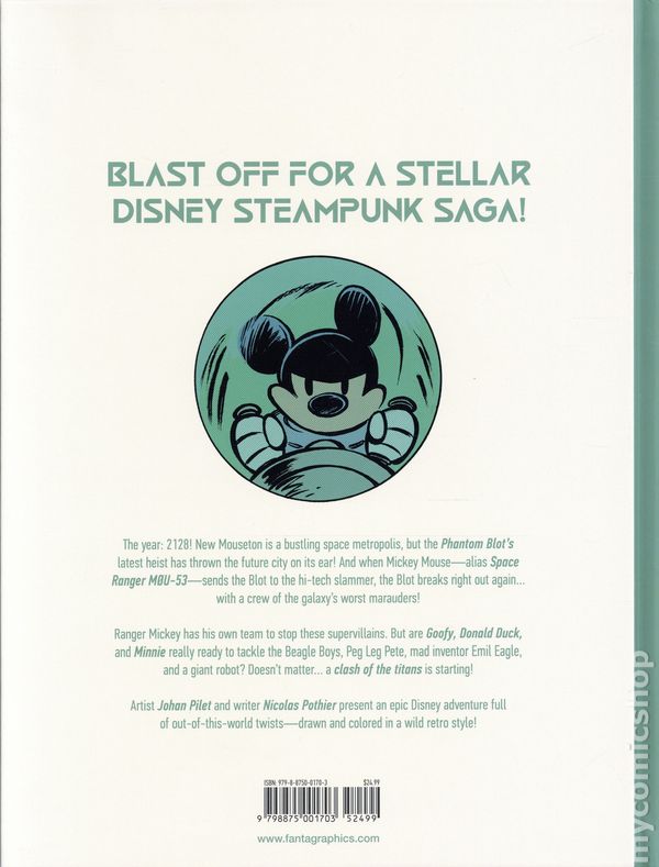 1st printing. Written by Nicolas Pothier. Art and cover by Johan Pilet. The year: 2128! New Mouseton is a bustling space metropolis. But the Phantom Blots latest trillion-dollar heist has thrown the future city on its ear! And when Mickey Mouse, Space Ranger, sends the Blot to the hi-tech slammer, the Blot reveals his master plan to break right out again... along with a state-of-the-art team of the galaxy's worst marauders! Ranger Mickey will need his own team to stop these supervillains. But are Goofy, Donald Duck, and Minnie really ready to tackle the Beagle Boys, Peg Leg Pete, mad submariner Dr. Vulter, and a giant robot? Doesn't matter—the Space Ranger Patrol is born, and a clash of the titans looms on the horizon! Artist Johan Pilet and writer Nicolas Pothier bring Fantagraphics an epic Disney adventure full of out-of-this-world twists—drawn and colored in a retro-futurist style and loaded with classic Franco-Belgian comics storytelling! Hardcover, 9 1/2-in. x 12-in., 56 pages, full color. All Ages Cover price $24.99.
