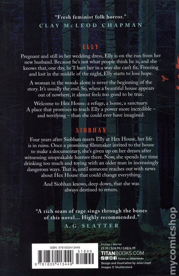 1st printing. By Amy Jane Stewart. A feverishly told, dark and unsettling Scotland-set fairy-tale about a safe haven for women which transforms them into vessels of revenge, perfect for fans of T. Kingfisher, A. G Slatter and Julia Armfield. ELLY - Elly is running. Pregnant and still in her wedding dress, she flees the cottage that her new husband has rented for their wedding night. Because he's not what people think he is – and she knows that, one day, hell hurt her in a way she cant fix. Freezing and lost in the dead of night, Elly begins to lose hope. A woman in the woods alone is never the beginning of the story. Its usually the end. So, when a beautiful house appears out of nowhere and a woman beckons her inside, it almost feels too good to be true. Welcome to Hex House: a refuge, a home, a sanctuary. A place that can only be found by those who truly need it; a place that promises to teach Elly how to access a power more incredible – and more terrifying – than anything she could have imagined. SIOBHAN - Four years after Siobhan meets Elly at Hex House, her life is in ruins. Once a promising filmmaker invited to the house to make a documentary with her brother, Theo, she's given up on her dream after witnessing unspeakable horrors there. Now, she spends her time drinking too much, toying with an older man in increasingly dangerous ways, and trying to get Theo to speak to her again. She ignores the scar on her stomach that never fully heals. That is, until someone reaches out with news about Hex House that could change everything. And Siobhan knows, deep down, that she was always destined to return. Softcover, 5-in. x 7 3/4-in., 368 pages, Text Only. Cover price $18.99.