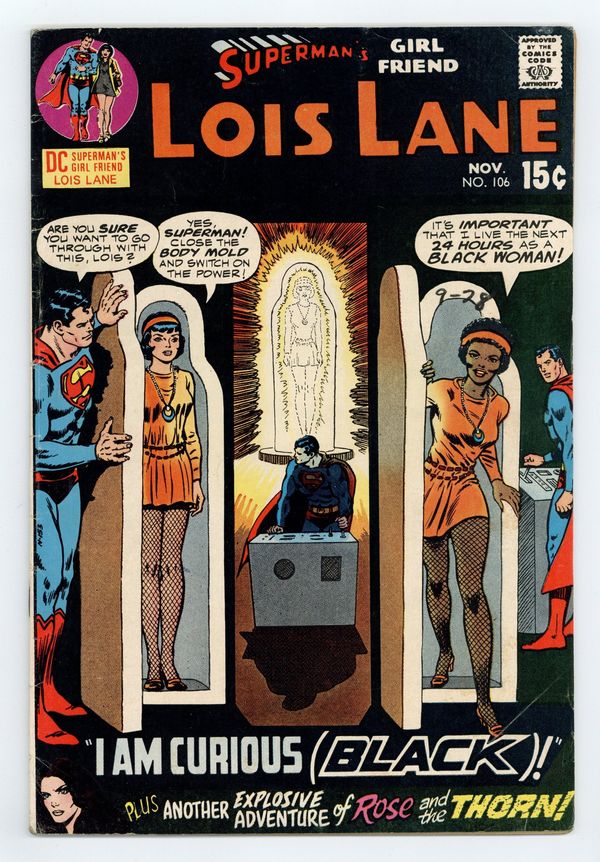 Starts May 25 Cover pencils by Curt Swan, inks by Murphy Anderson. I Am Curious (Black)!, script by Robert Kanigher, pencils by Werner Roth, inks by Vince Colletta; In order to do a story on the African-American community in Metropolis, Lois uses a Kryptonian machine to make herself appear African-American. Martha G. Kimball--Wonder Women of History article by Julius Schwartz, art by John Giunta. Where Do You Plant a Thorn?, script by Robert Kanigher, pencils by Ross Andru, inks by Mike Esposito; Mr. Orchid tries to kill Thorn for the 100. Direct Currents ad, art by Neal Adams. 36 Pages, Full Color. Cover price $0.15.