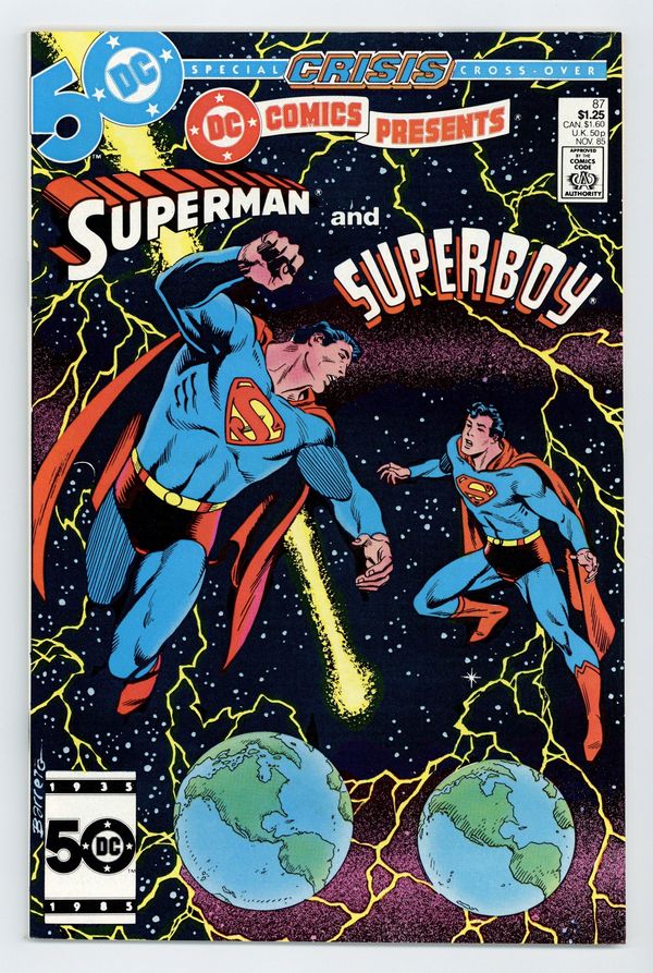 Starts May 18 Newsstand Edition. Crisis on Infinite Earths cross-over. Zapped by an alien ray, Superman hops dimensions and teams up with Superboy-Prime to battle Polarians on Earth-Prime in the 24-page "Year of the Comet." Continued in Adventures of Superman (1939) #414. Script by Elliot S! Maggin, art by Curt Swan & Al Williamson. Plus: the 16-page "Origin of Superboy-Prime" by Maggin, Swan & Williamson. Cover by Eduardo Barreto. Cover price $1.25.