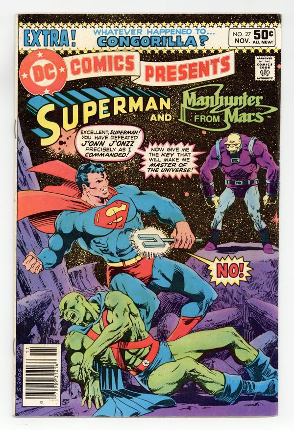 Starts May 18 Newsstand Edition. Superman and Manhunter from Mars star in "The Key That Unlocked Chaos!" First appearance of Mongul. Written by Len Wein, with art by Jim Starlin, Dick Giordano and Frank McLaughlin. Characters: Superman; Martian Manhunter [J'onn J'onzz, Manhunter from Mars]; Mongul (intro, villain); Steve Lombard; Jimmy Olsen; Lois Lane; The Warzoon (aliens, flashback); The Largas (aliens, flashback); green kryptonite. Plus: "Whatever Happened to Congorilla?" Written by Bob Rozakis, with art by Romeo Tanghal and Frank Chiaramonte. Characters: Congo Bill; Congorilla; Golden Gorilla; Janu; Mose; K'Bani (villain); Fred Cantrell (villain). Cover by Jim Starlin. Cover price $0.50.