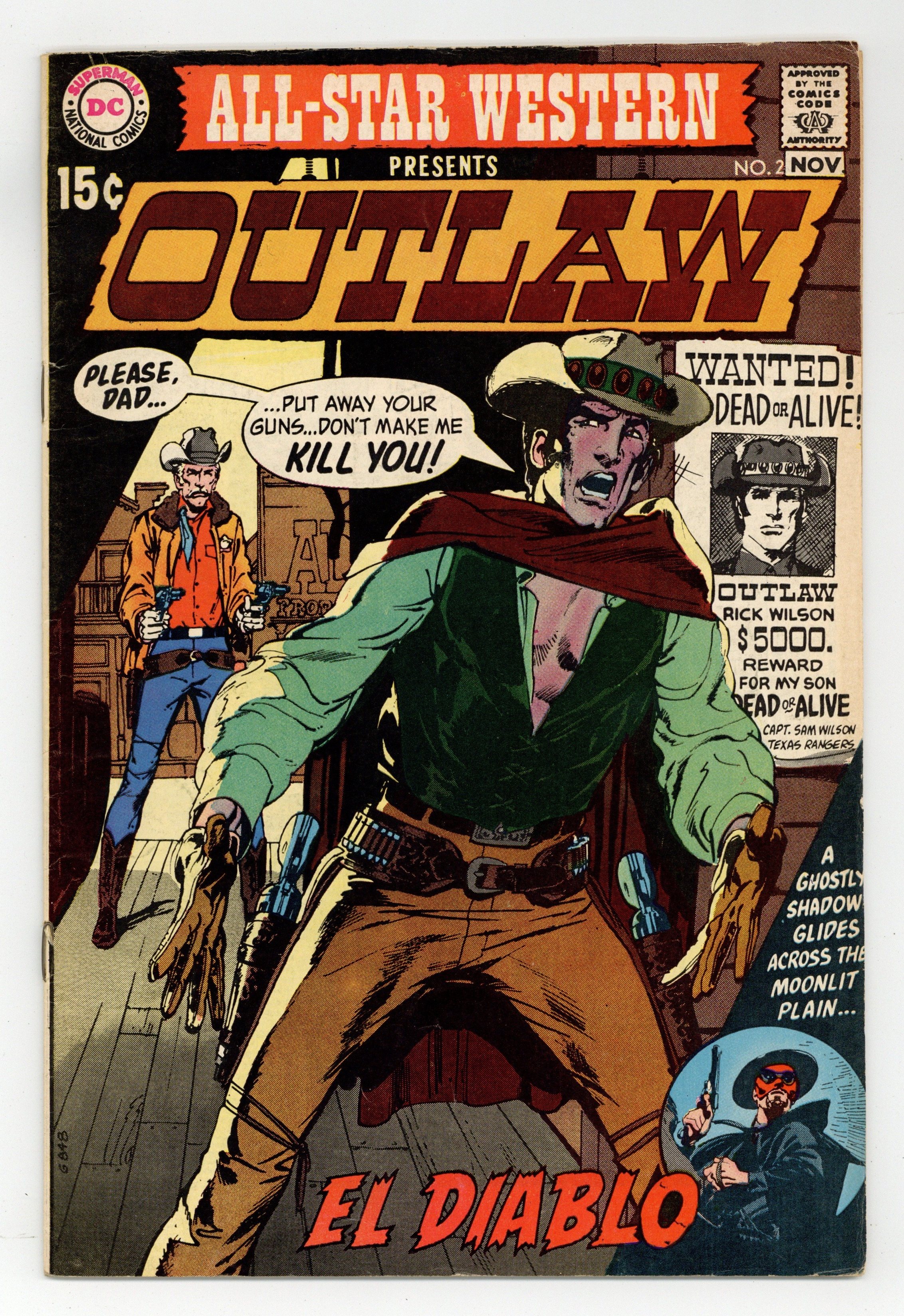 Starts May 25 Cover art by Neal Adams. "Draw Death," script by Robert Kanigher, art by Tony DeZuniga; Rick Wilson dreamed all his life to become a Texas Ranger like his father; He is tricked into a life of crime by the Fenton Gang and is now pursued by his father. "The Devil Has Two Faces!", script by Robert Kanigher, art by Gray Morrow; El Diablo stops some highway men from robbing a stagecoach but then learns that a pregnant woman inside is giving birth. "Now Comes the Winter's Wind" text story by Gerry Conway. 36 pgs., full color. Cover price $0.15.