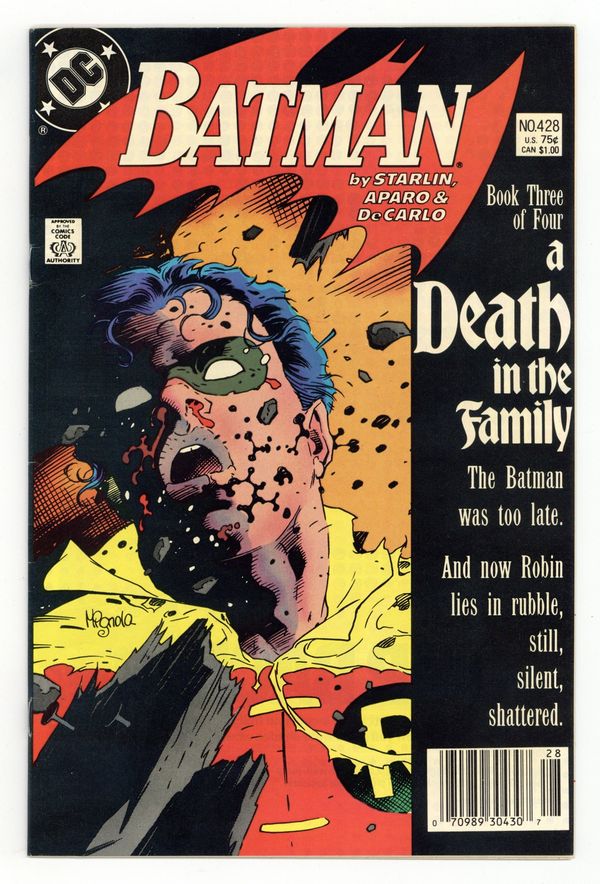 Ends May 4 7:33 PM CST Bid History 3 bids Current Bid $11 Your Secret Max Bid If you'd like to bid, please log in or register. First printing. Direct Edition. Cover art by Mike Mignola. "A Death in the Family" part 3 of 4, script by Jim Starlin, pencils by Jim Aparo, inks by Mike DeCarlo; Death of Sheila Haywood; Burial of Sheila Haywood and Jason Todd; The Joker becomes the Iranian Ambassador to the U.N. Results of Phone Poll as to whether Robin dies this issue or not. NOTE: Most issues from 397-432 were reprinted in 1989 and sold in multipacks. These 2nd and 3rd prints have back cover ads dated 1989. 36 Pages, Full Color. Cover price $0.75.