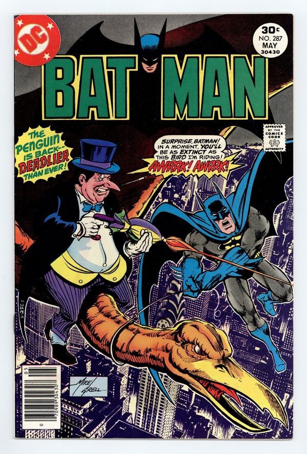 Starts May 4 Last 30-cent cover price. Cover art by Mike Grell. The Maltese Cup Cake Hostess snack cakes ad with Wonder Woman. "Batman-Ex--As in Extinct!", script by David Vern (as David V. Reed), pencils by Mike Grell, inks by Bob Wiacek; The Penguin uses robots of extinct birds or ancestors of birds, starting with a robot pterosaur, top commit crimes; The robot cracks out of a Napoleon statue at Gotham's La Galerie; Batman destroys the robot bird, but Penguin and his gang pull off a jewel robbery; Penguin sends an archeopteriz robot to panic the crowds at Gotham City Music Hall where a movie about Machiavelli is playing; Meanwhile, his gang robs a diner on 1805 Hamilton Street; Batman captures the crooks, but then learns of an attack on the schooner Nelson by a robot Diatryma. Statement of ownership; Average # of copies sold previous year: 178,000. Text article with photograph of publisher Jenette Kahn. Walt Simonson profile by Mike Gold. 36 Pages, Full Color. Cover price $0.30.