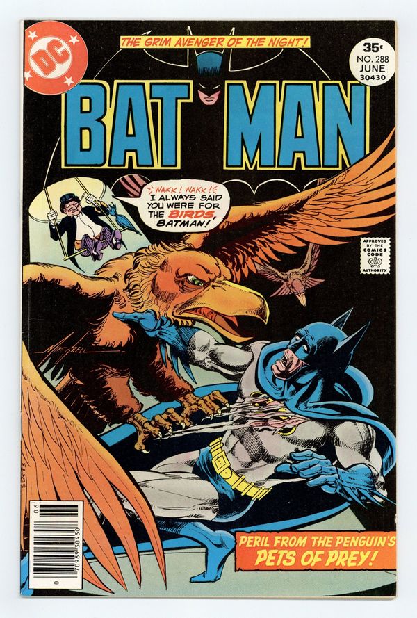 Starts Jun 8 Last 30-cent cover price. Cover art by Mike Grell. The Maltese Cup Cake Hostess snack cakes ad with Wonder Woman. "Batman-Ex--As in Extinct!", script by David Vern (as David V. Reed), pencils by Mike Grell, inks by Bob Wiacek; The Penguin uses robots of extinct birds or ancestors of birds, starting with a robot pterosaur, top commit crimes; The robot cracks out of a Napoleon statue at Gotham's La Galerie; Batman destroys the robot bird, but Penguin and his gang pull off a jewel robbery; Penguin sends an archeopteriz robot to panic the crowds at Gotham City Music Hall where a movie about Machiavelli is playing; Meanwhile, his gang robs a diner on 1805 Hamilton Street; Batman captures the crooks, but then learns of an attack on the schooner Nelson by a robot Diatryma. Statement of ownership; Average # of copies sold previous year: 178,000. Text article with photograph of publisher Jenette Kahn. Walt Simonson profile by Mike Gold. 36 Pages, Full Color. Cover price $0.30.