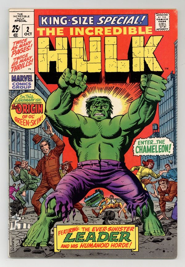 Starts May 18 Featuring "The Origin of the Hulk!" by Stan Lee and Jack Kirby. Then, the Hulk matches his brawn against the mad genius of the Leader in a 5 part epic. "Enter the Chameleon!" "A Titan Rides the Train!" "The Horde of Humanoids!" "On the Rampage Against the Reds!" And, "The Power of Doctor Banner!" Captain America cameo. Story by Stan Lee. Art by Steve Ditko, George Bell, Dick Ayers, and Vince Colletta. Cover by Herbe Trimpe. 68 pages. Cover price $0.25.