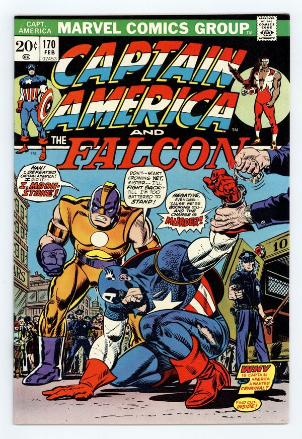 Starts May 25 "J'Accuse!" Guest-starring the Black Panther. Plot by Steve Englehart. Script by Mike Friedrich. Pencils by Sal Buscema. Inks by Vince Colletta. Cover by Gil Kane (pencils) and John Romita Sr. (inks). In a stunning development, the Tumbler somehow died during his fight against Captain America. And now the star-spangled avenger is being accused of murder! Cap wants to clear his name, so he runs from the police...and runs right into a new super-villain called Moonstone! In the meantime, in Wakanda, Sam Wilson and Leila Taylor tour T'Challa's state-of-the-art laboratory. Will the Black Panther give flight to the Falcon? First (full) appearance of Moonstone (aka Lloyd Bloch). Origin of Moonstone. First (cameo) appearance of the Falcon's new costume with wings. Cameo appearances by Quentin Harderman, Stoneface, and the Tumbler. 36 pages. Cover price $0.20.